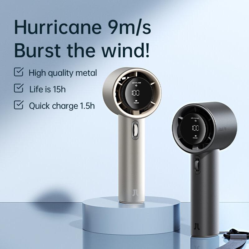 - This compact, portable fan features a stylish design, is lightweight, and easy to carry. It features an LED display for wind speed and battery life, and offers 100 adjustable fan speeds. Charging takes 1.5-2 hours, and the battery lasts up to 15 hours.
