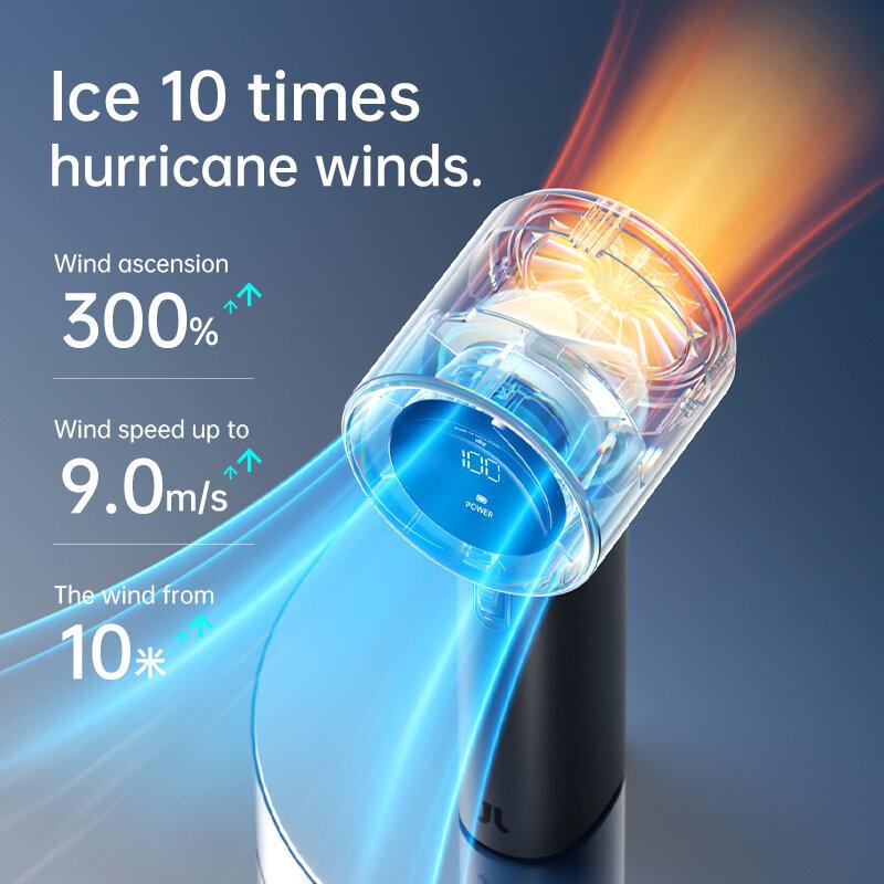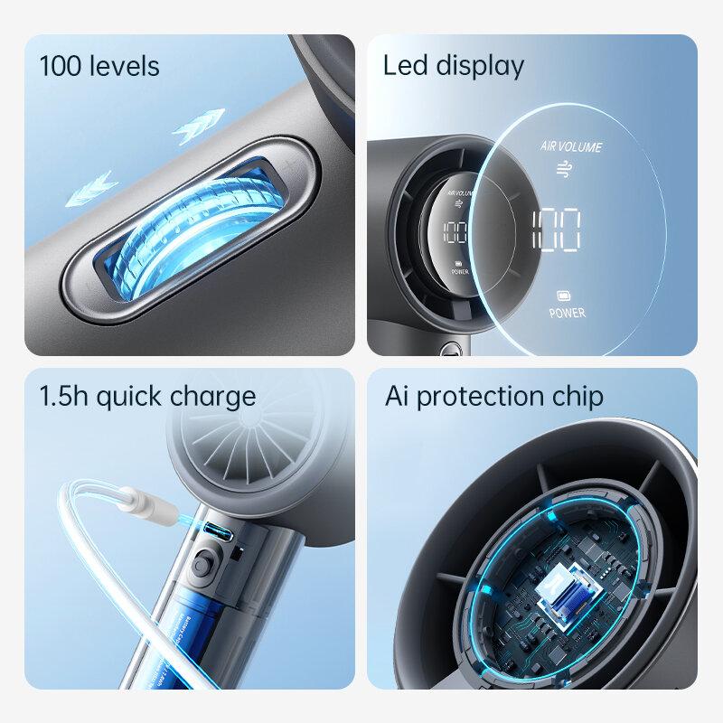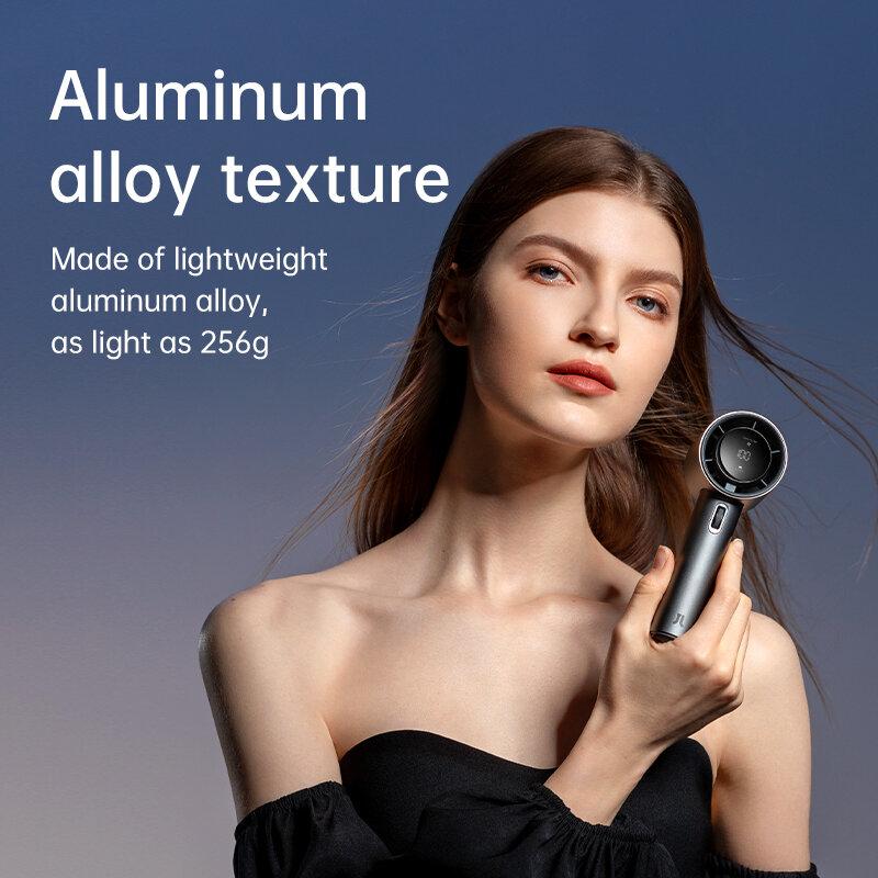 - Made of durable, lightweight aluminum alloy, it features an LED display for wind speed and battery life, and offers 100 adjustable fan speeds.